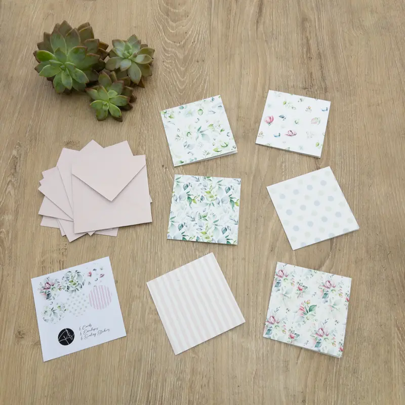 | These beautiful gift cards are blank inside so are suitable for all occasions. This pack of 6 cards includes hand made envelopes and stickers to seal them. Size 80 x 80mm. |