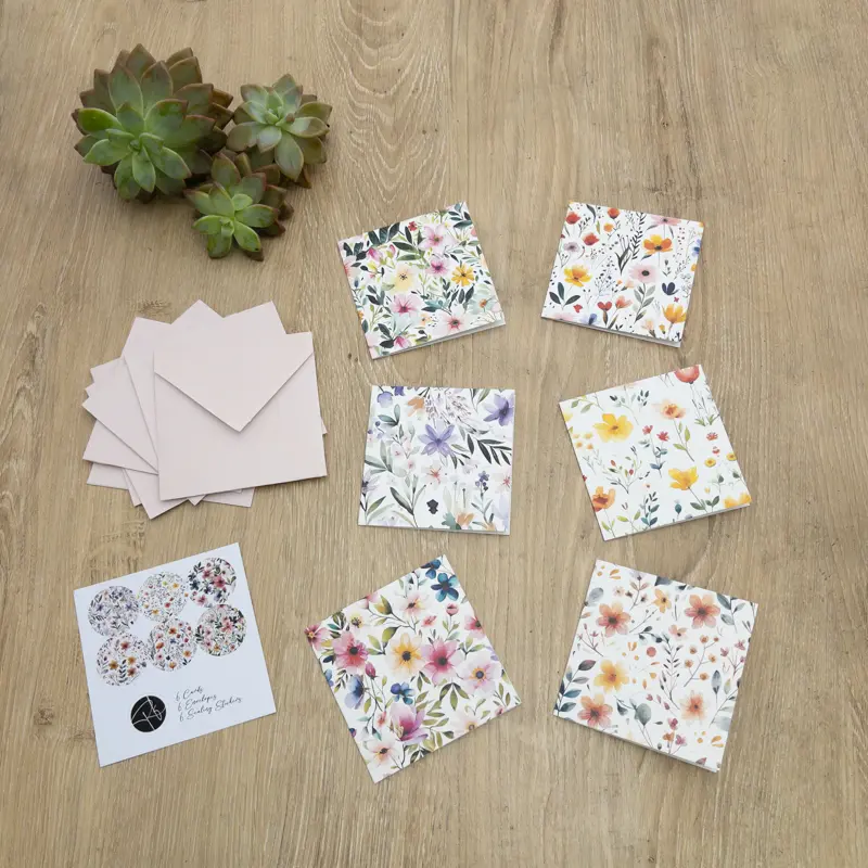 These beautiful gift cards are blank inside so are suitable for all occasions.  This pack of 6 cards includes hand made envelopes and stickers to seal them. Size 80 x 80mm.